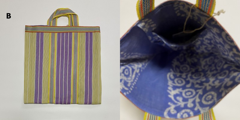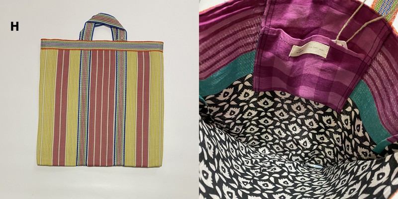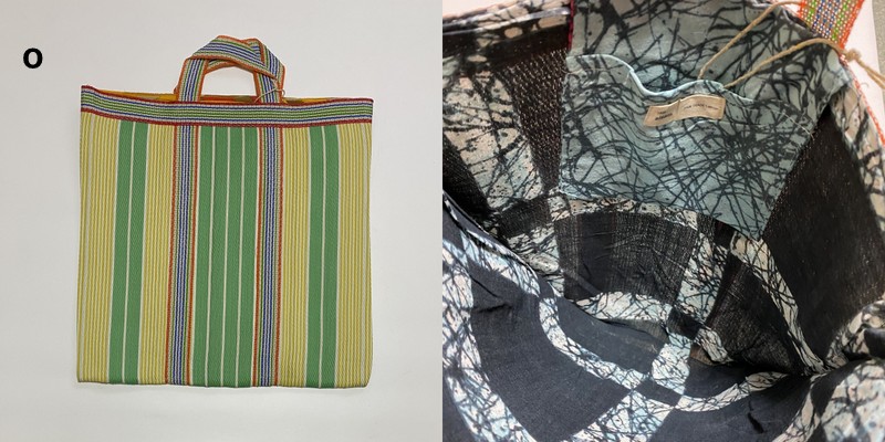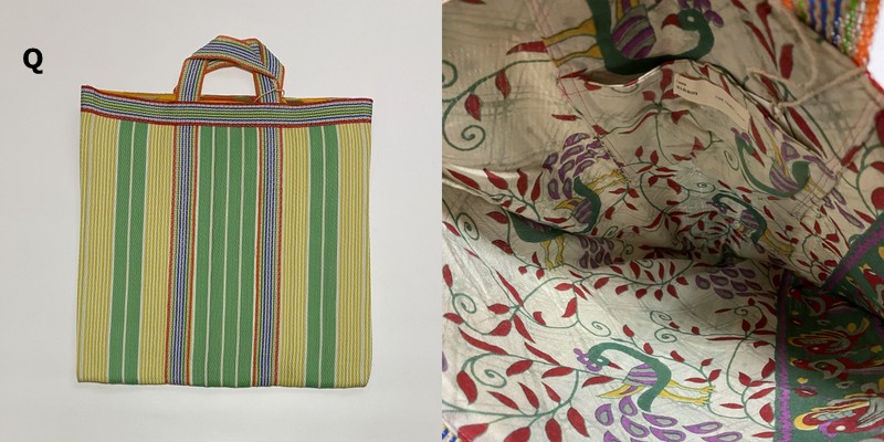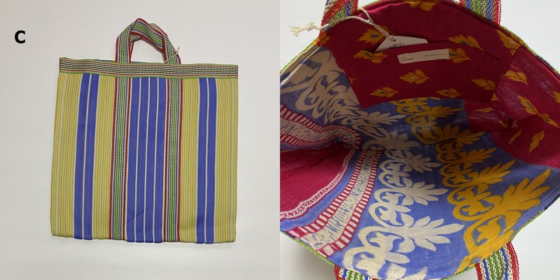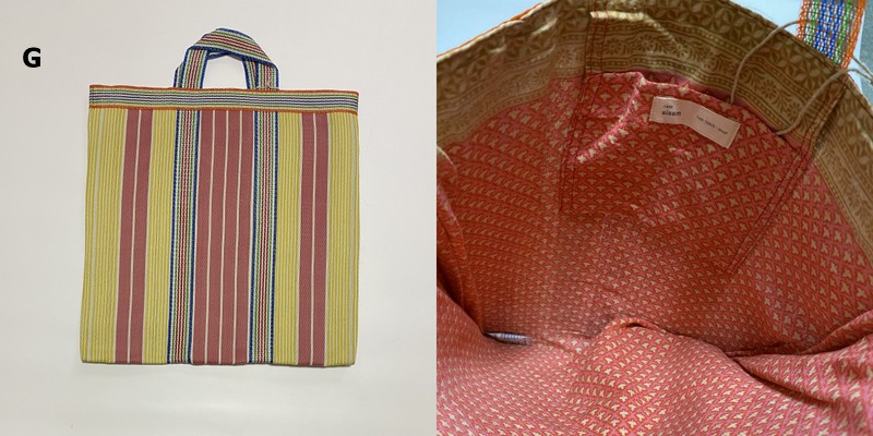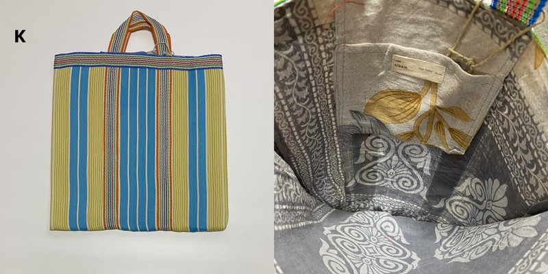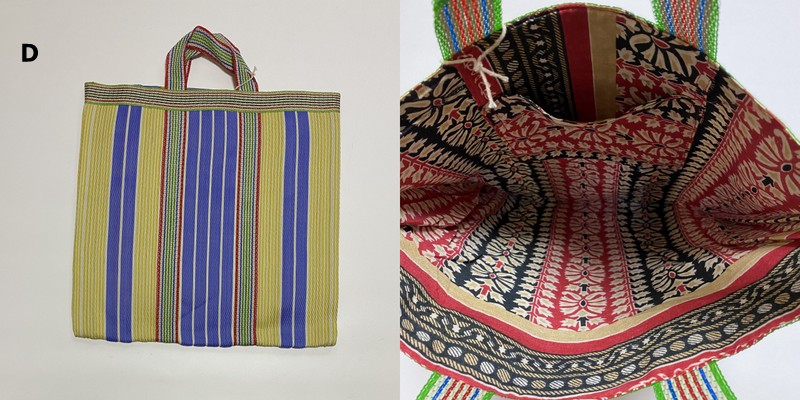 シサム工房さんの解説を読んだところ、この手提げは、インドで作られていて、表側の素材はナイロン。壊れてしまったプラスチック製品を溶かし、ひも状にしたものを作り、ナイロン生地として再生しているのだそうです。