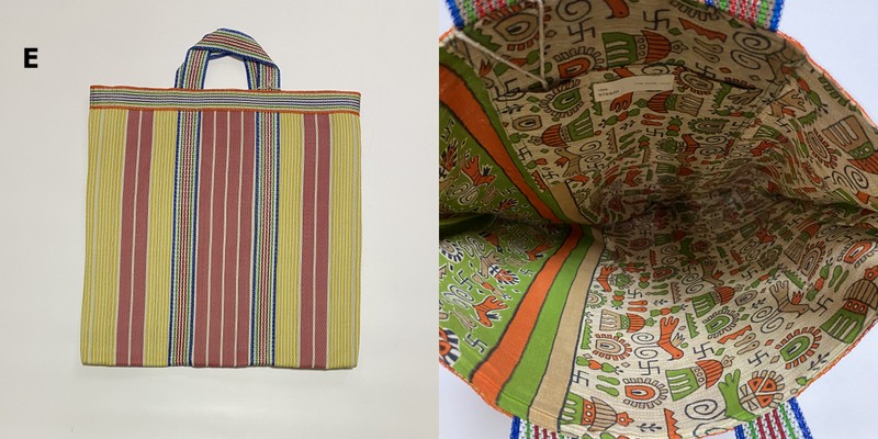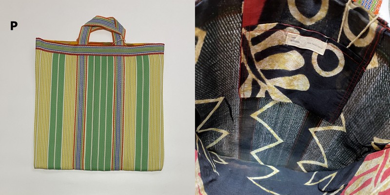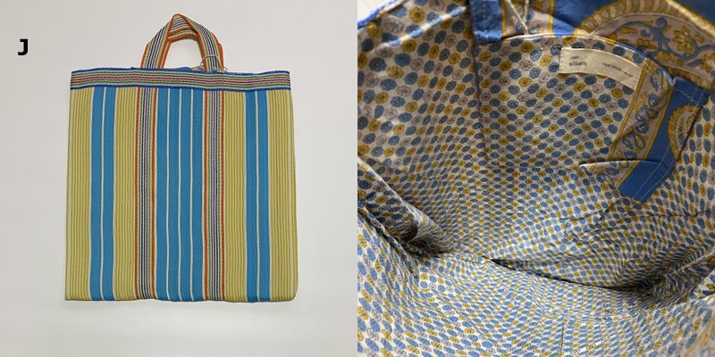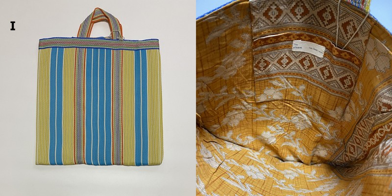 表も裏もアップサイクルした素材のユニークな手提げ!【宅配便でのお届けです】